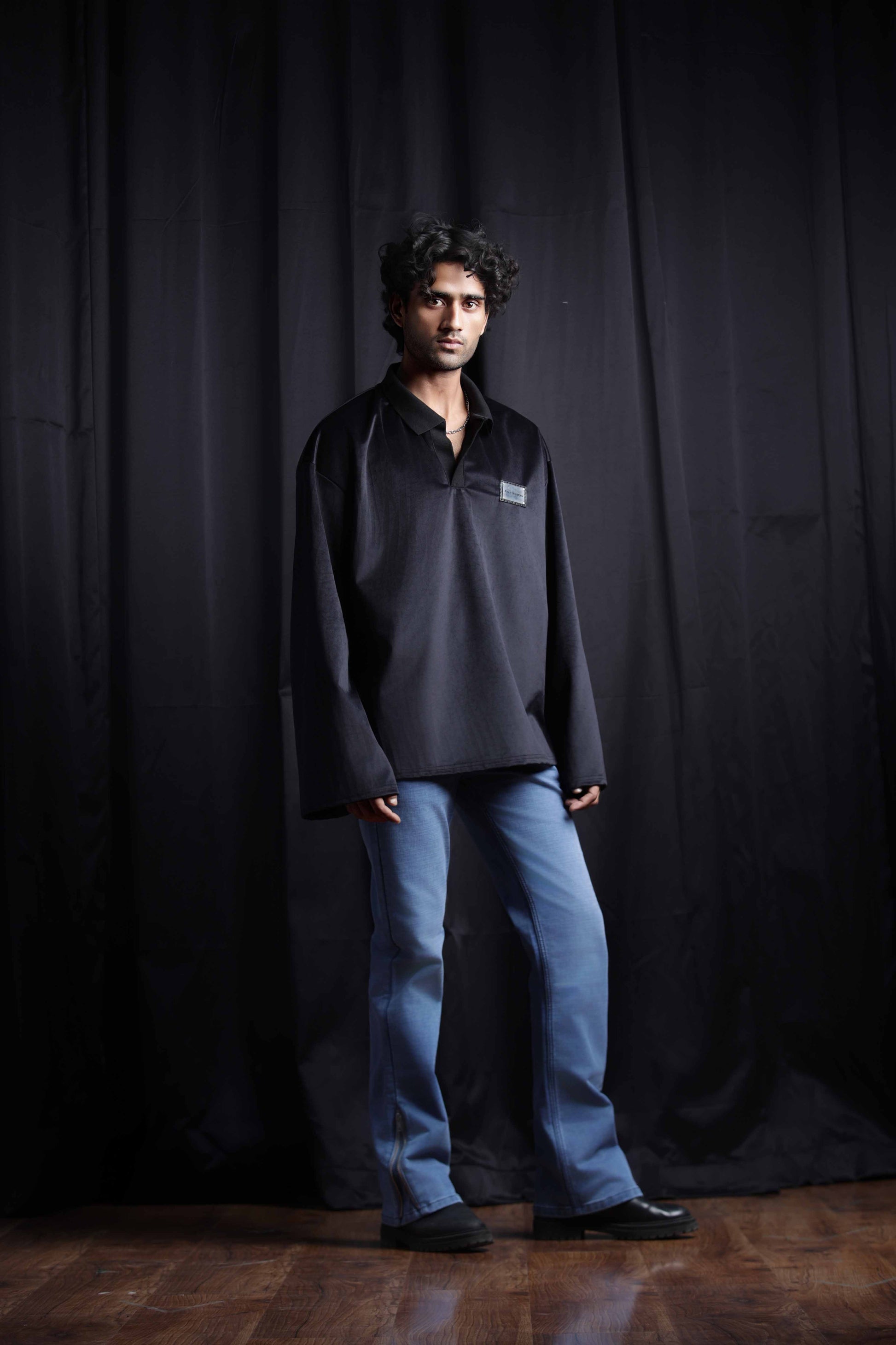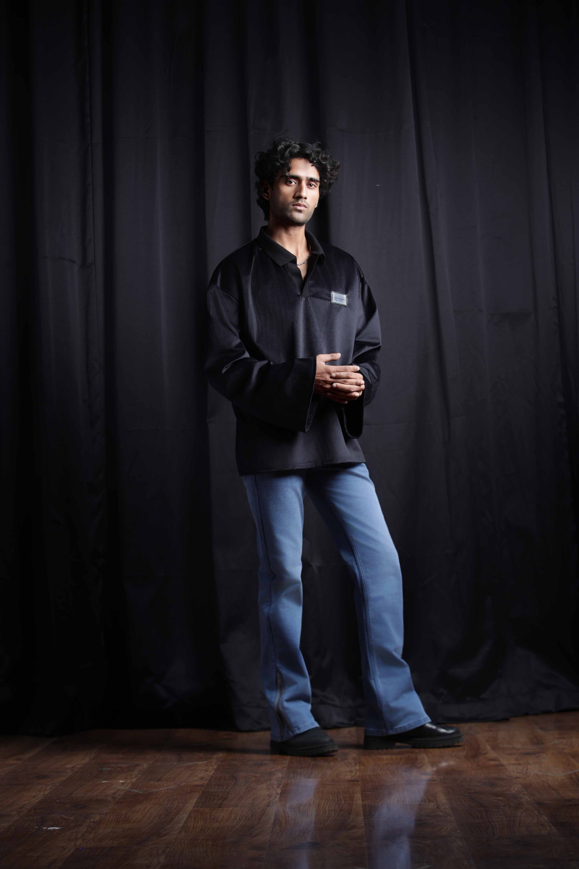A signature metal plate branding sits boldly on a premium leather patch, hand-stitched for a refined edge — symbolizing strength and individuality. The relaxed silhouette with flared sleeves gives it a bold, statement-making flow while keeping it easy to wear