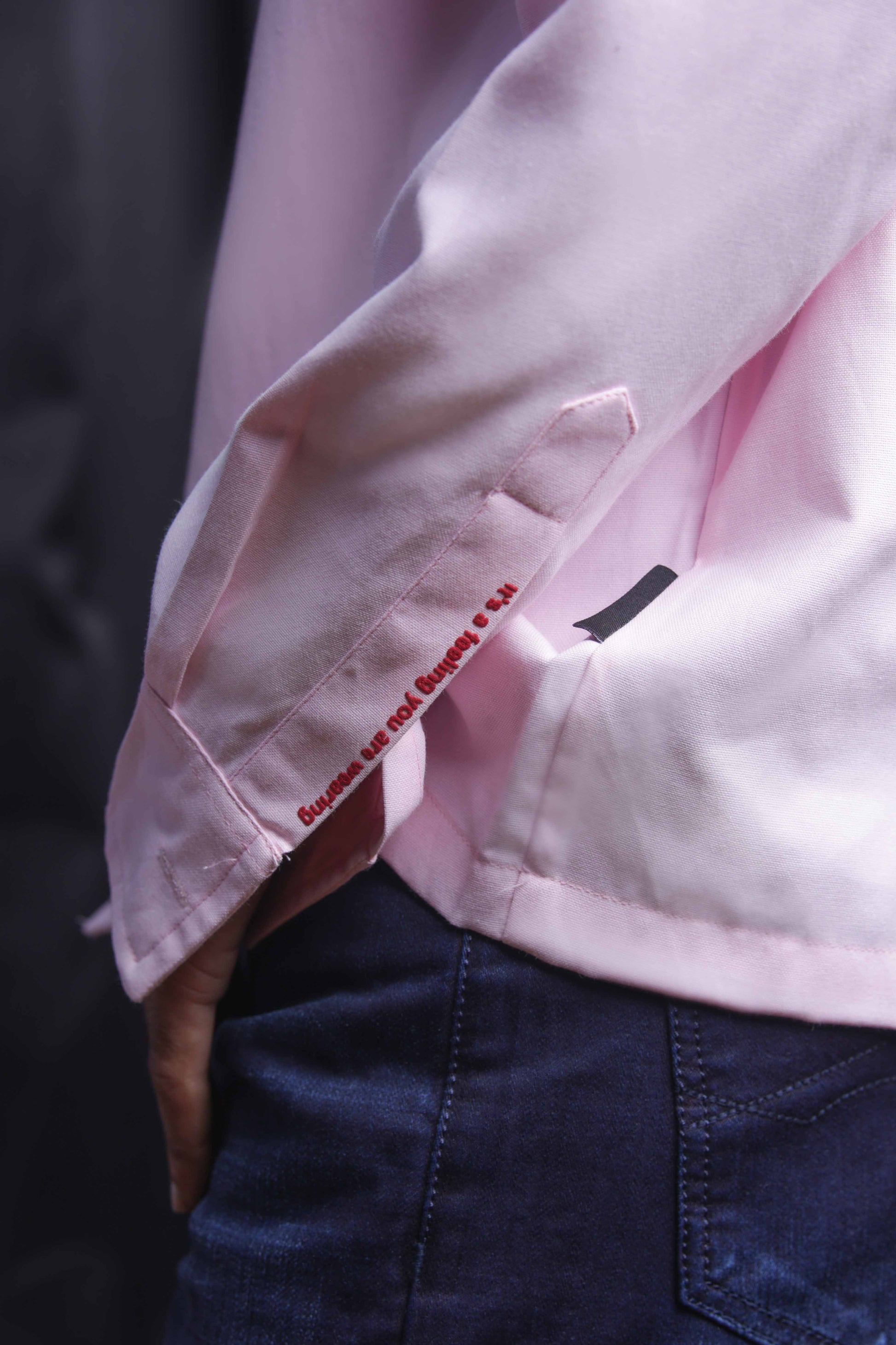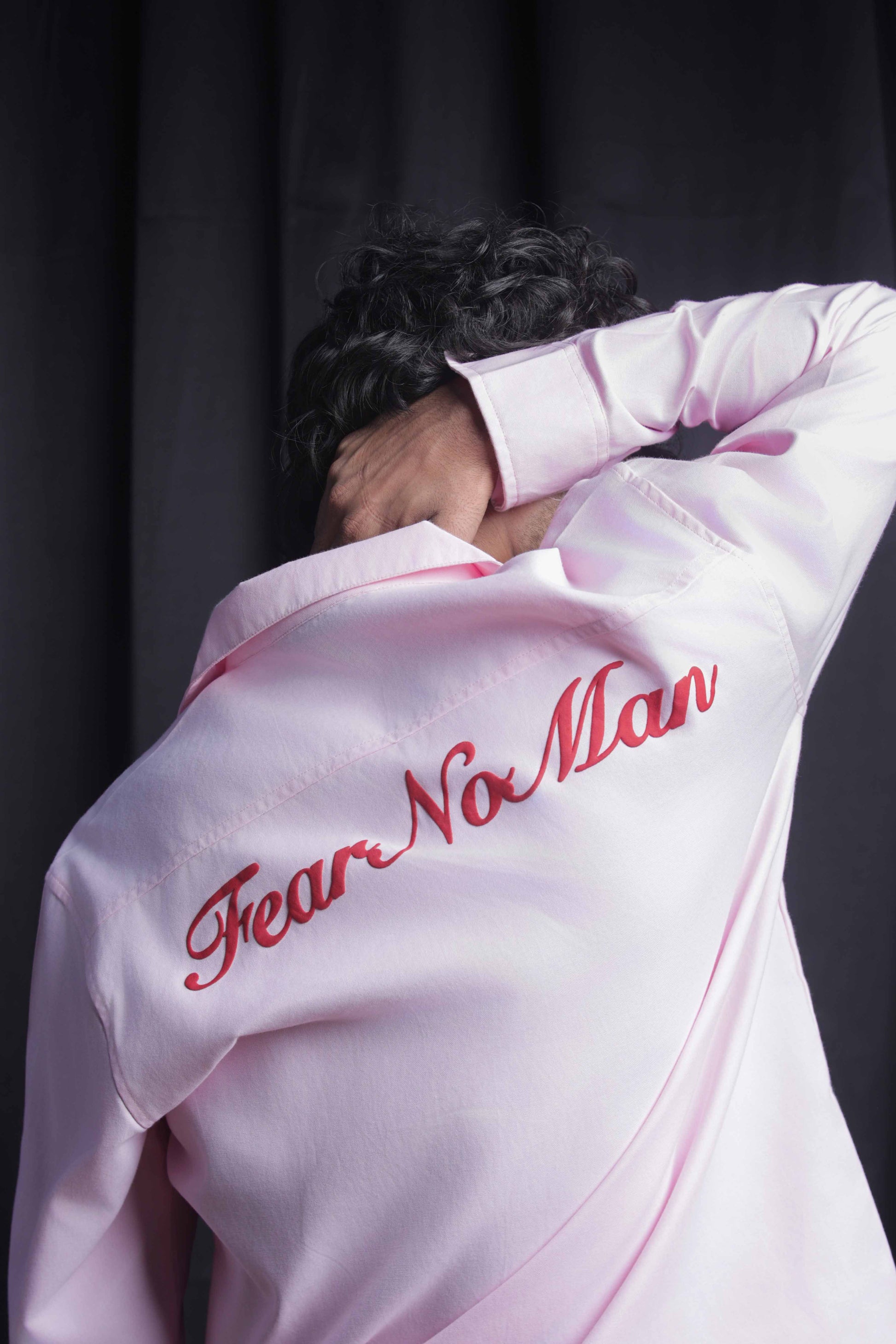 The pastel pink tone contrasts beautifully with the bold red “Fear No Man” branding on the chest, sleeve, and back — a reminder that strength can exist in softness. Designed for versatility — from calm days to confident nights.