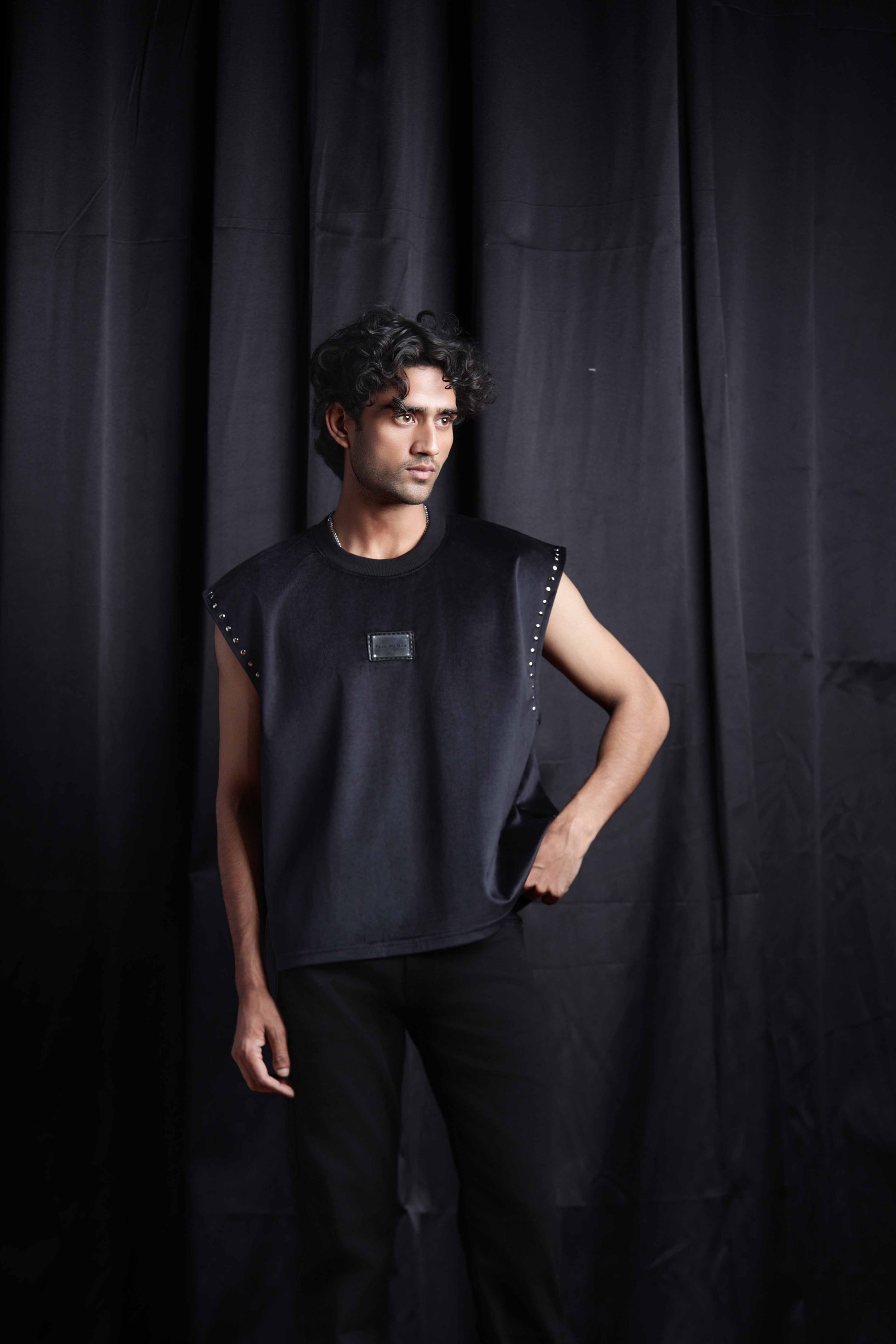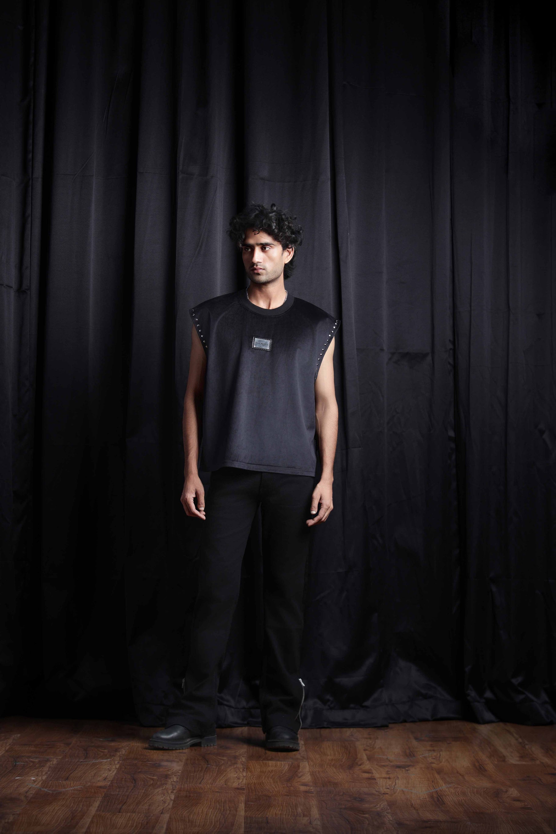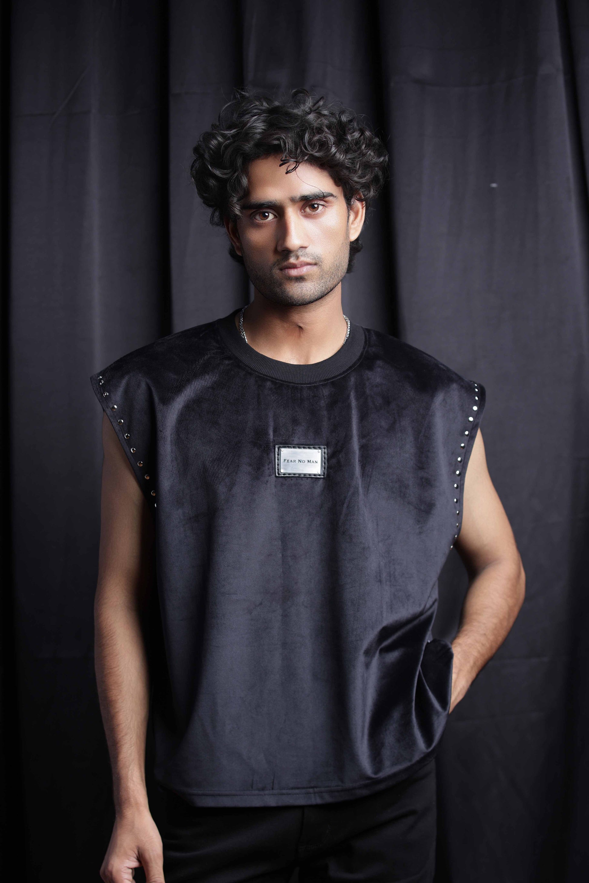 The Shadow Luxe tank top studded with studs is crafted from ultra-soft , premium velvet that exudes comfort and luxury. Designed with statement stud detailing along the sleeves and a signature steel plate branding at the center stitched on a leather patch , this piece brings together boldness and sophistication.