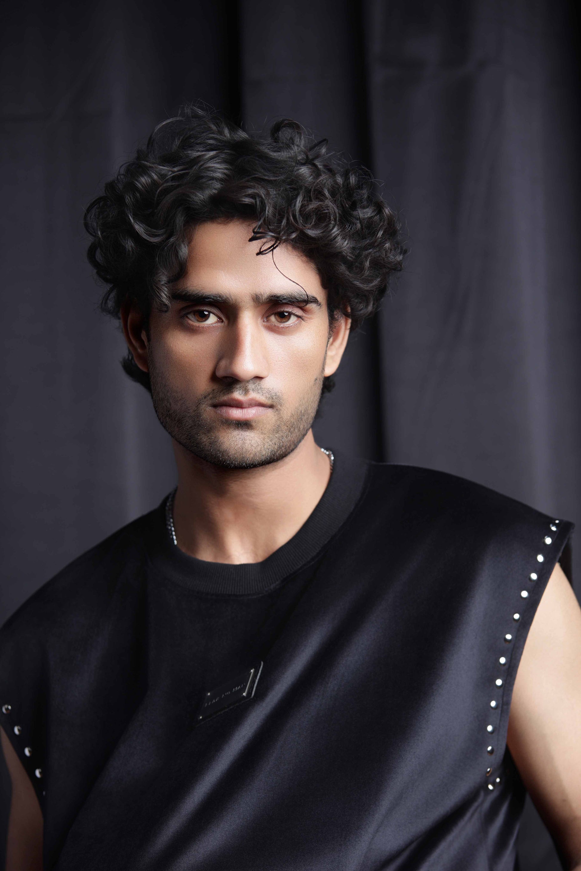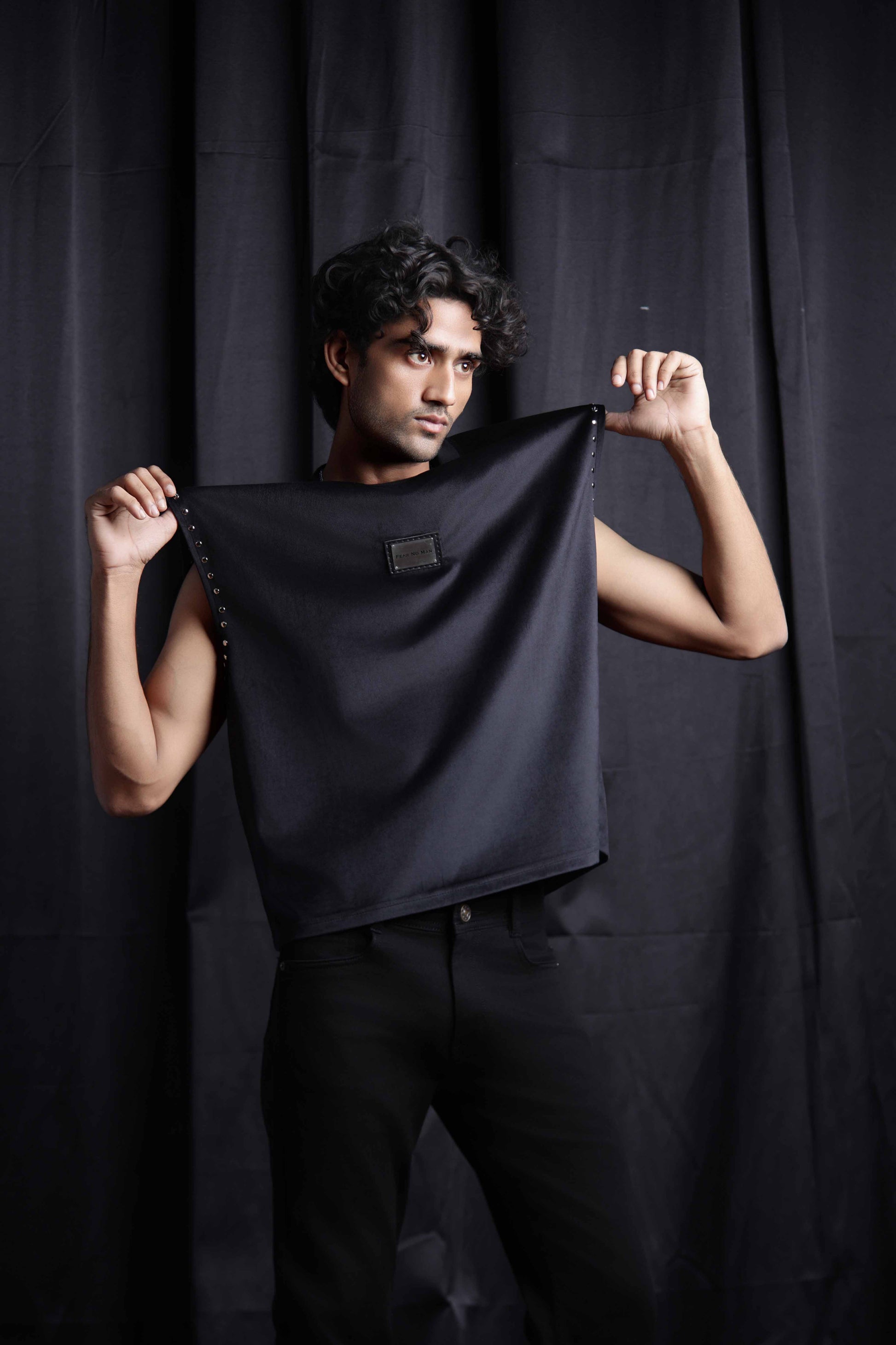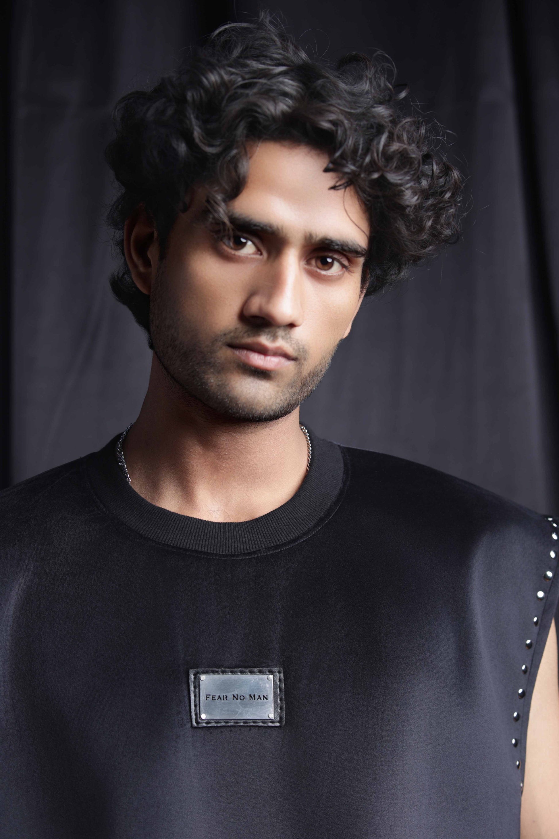 The Shadow Luxe tank top studded with studs is crafted from ultra-soft , premium velvet that exudes comfort and luxury. Designed with statement stud detailing along the sleeves and a signature steel plate branding at the center stitched on a leather patch , this piece brings together boldness and sophistication.